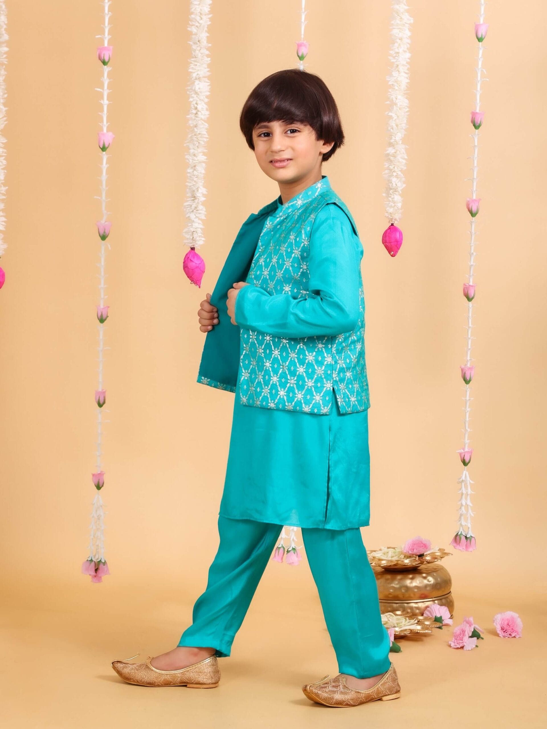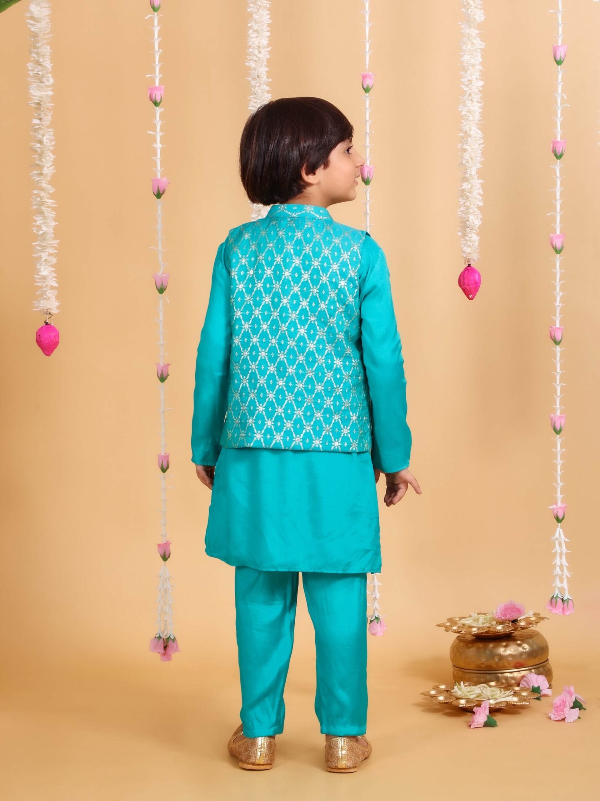 | Pack Contains : 1 Kurta, 1 Pant,1 Jacket | Color : Aqua |